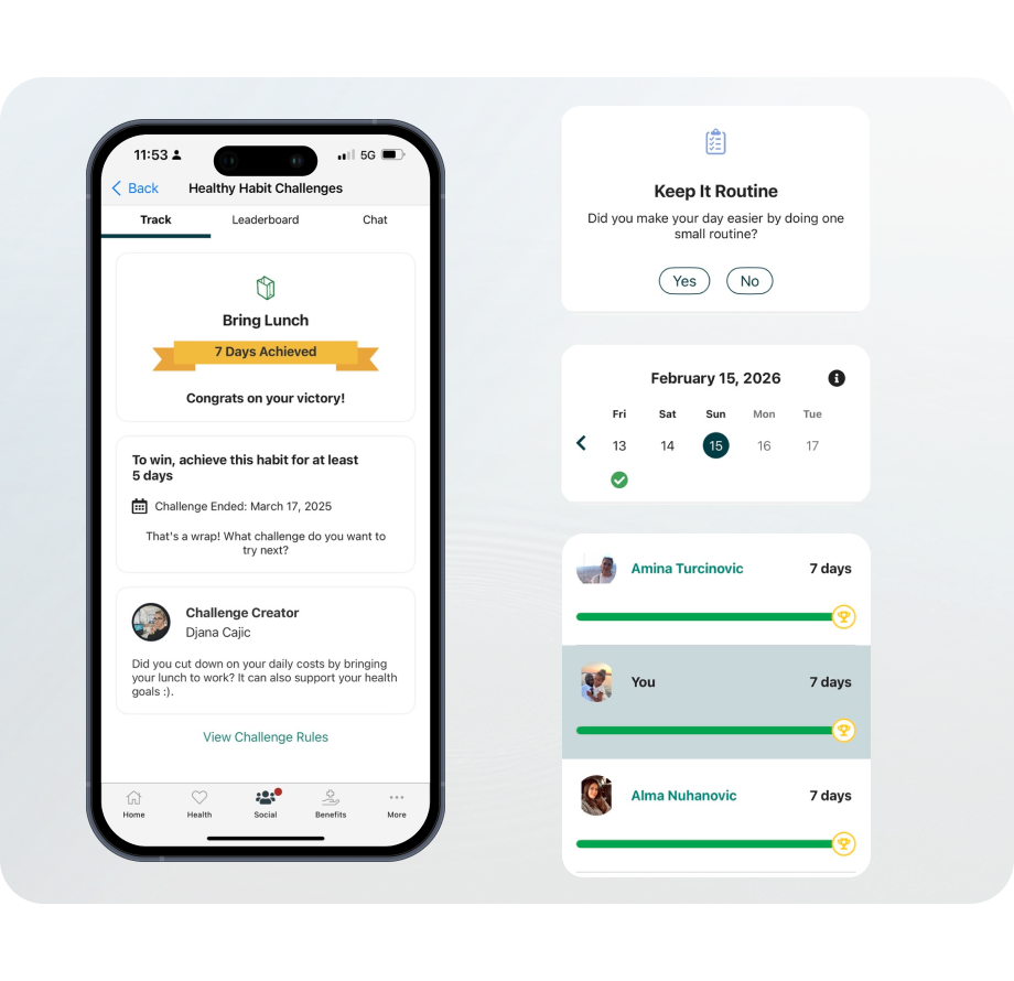 Redesigned the Personal Challenges experience for a digital health platform, improving web responsiveness and clarifying key challenge states such as invite flows, active competition, and post-challenge results. The work focused on supporting both step-based and habit-based challenges while improving usability across desktop and mobile.